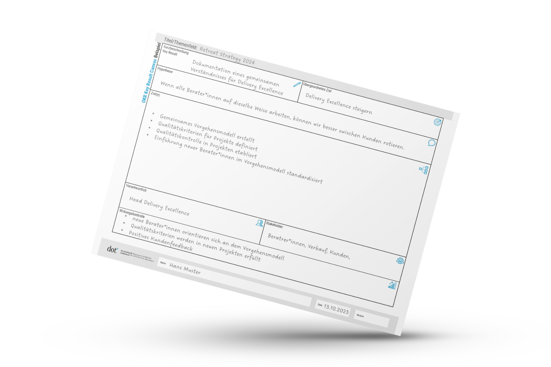 - Sind die Objectives definiert, kannst du sie mittels dem Key Result Canvas weiter konkretisieren. Jedes Key Result verfolgt eine zu definierende Hypothese. Diese wird durch mind. ein Ziel, in der Regel mehrere, verfolgt. Mit der Wirkungskontrolle definieren wir zu Beginn, wie wir den Erfolg des Key Results messen wollen. Pro Key Result gibt es folglich ein Key Result Canvas.